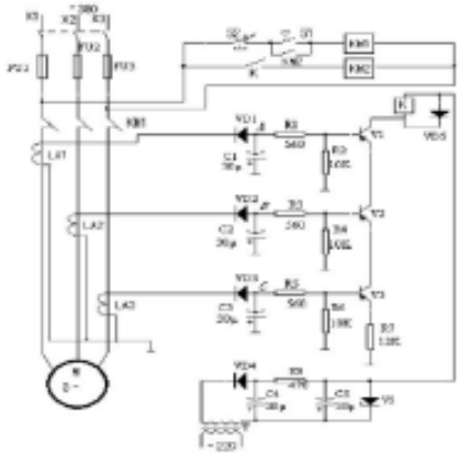 若由于某種原因造成三相電源中任一相斷相時, 則該相電壓信號為零, 相應的晶體管將截止, 使繼電器 K 和交流接觸器均釋放, 切斷電動機 M 的工作電源, 從而保護電動機不會因缺一相電源, 變成兩相運行, 過熱而損壞。